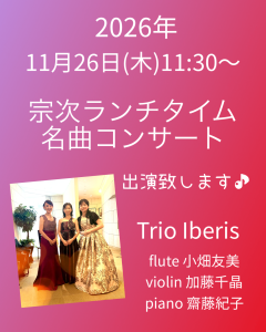 Trio Iberis~トリオ・イベリス コンサート情報 Trio Iberis ~トリオ・イベリス フルート・ヴァイオリン・ピアノ Trio Iberis ~トリオ・イベリス Instagramにて発信中♪ ********************** 2026年11月26日(木) 宗次ランチタイム名曲コンサート 出演決定! 詳細が決まりましたら、お知らせいたします。 ♬2025・11・10(月) 宗次ランチタイム名曲コンサート 宗次ホール(愛知県名古屋市) こちらは終了いたしました。 お越しいただきました皆様、ありがとうございました。